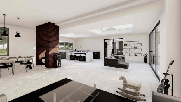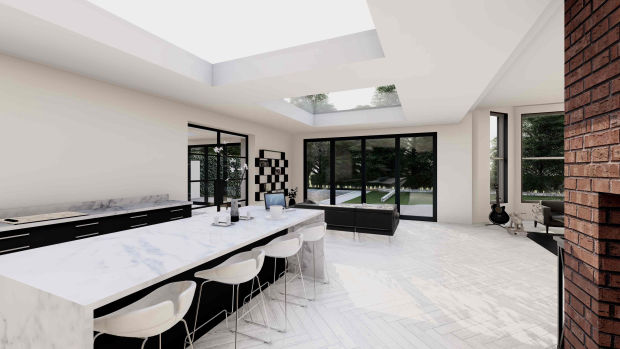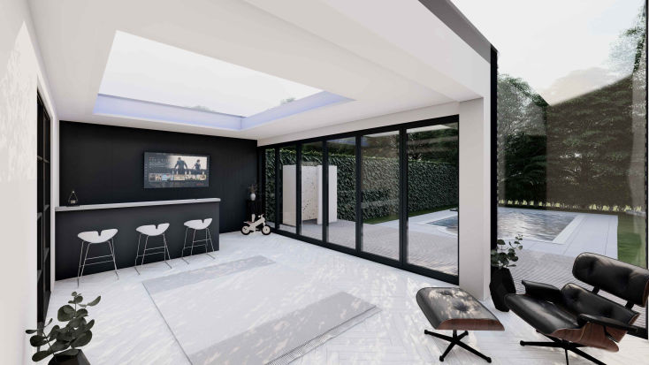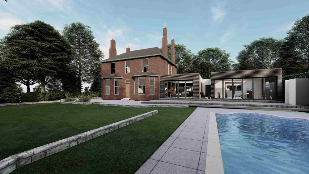 This commission is for the extension of a house which is to include a new kitchen, a fabulous bar and family area overlooking the swimming pool, plus a fitness centre.